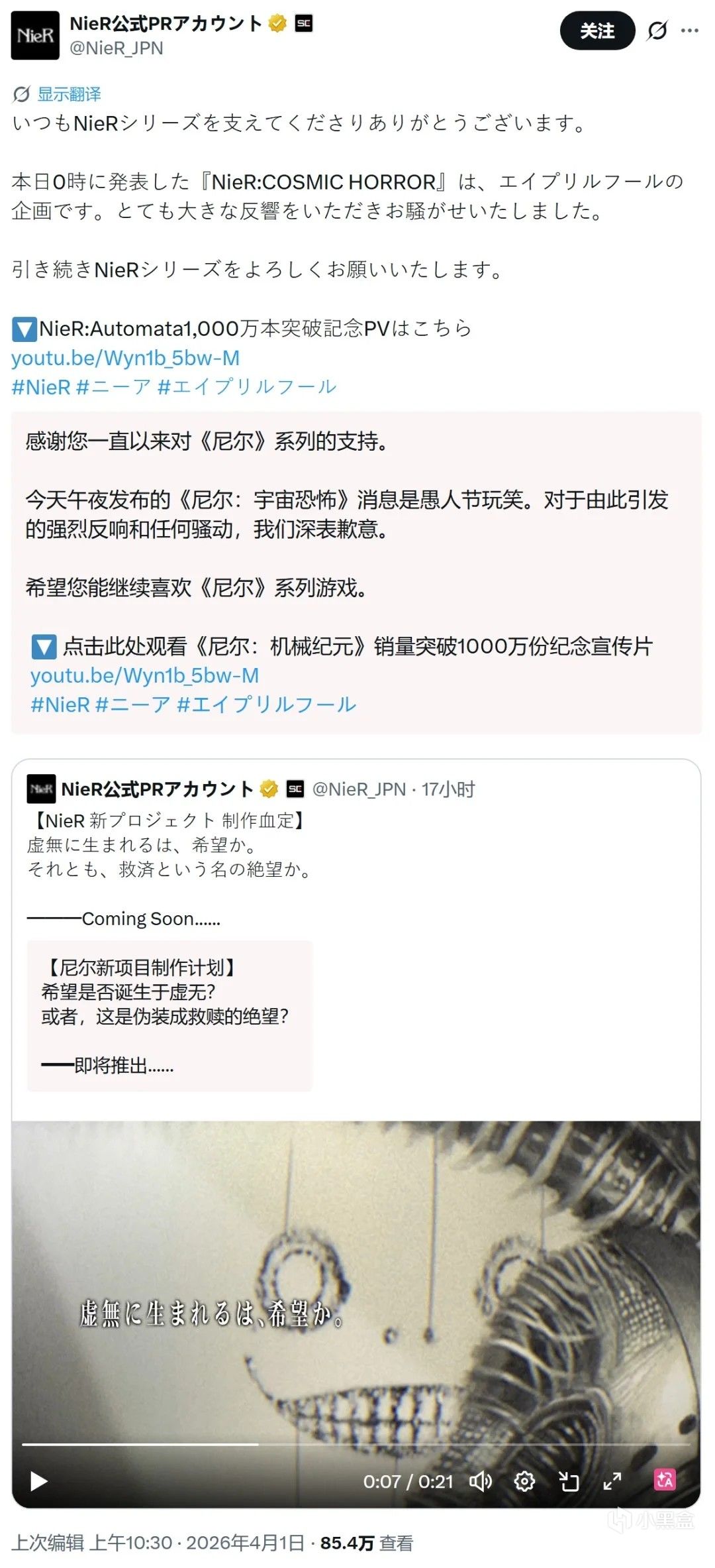 可能是趁着愚人節,《尼爾》官方發了叫《尼爾:宇宙恐怖》的遊戲視頻,並配上海報、配上【即將推出】的字眼,把一批粉絲整得原地心跳加速還以爲出新作了。