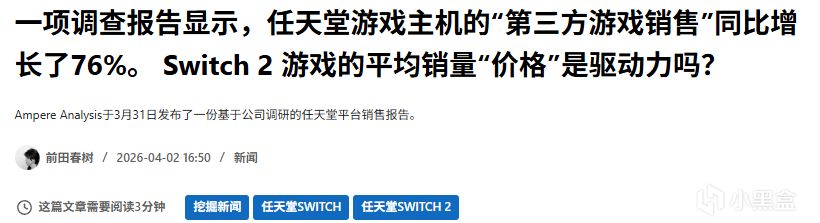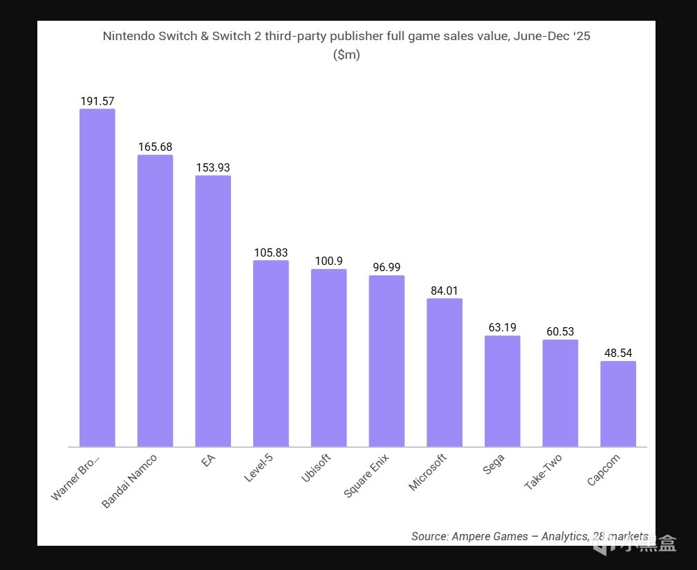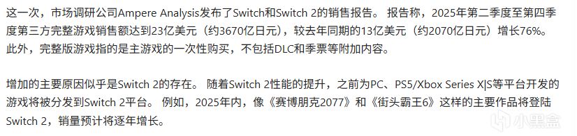 市場調查機構Ampere Analysis於3月31日發佈報告顯示,2025年第2季度至第4季度,任天堂Switch及Switch 2平臺第三方完整遊戲(不含DLC等附加內容)銷售額達到23億美元,較前年同期的13億美元大幅增長76%。