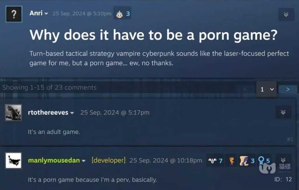 早在2024年9月,一位用户在Steam社区表达了对游戏成人内容的反感,他说道:“这是一款回合制策略游戏,融合了吸血鬼赛博朋克元素,对我来说堪称完美,但是……它真的需要是一款涩请游戏吗?”