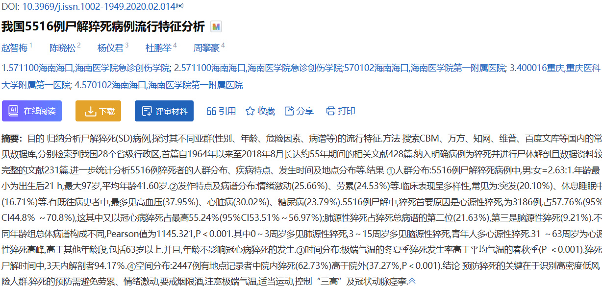 1.趙智梅,陳曉松,楊儀君,等. 我國5516例尸解猝死病例流行特徵分析[J]. 中國急救醫學,2020,40(2):158-163. DOI:10.3969/j.issn.1002-1949.2020.02.014 .