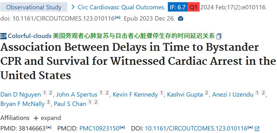 3.Nguyen DD, Spertus JA, Kennedy KF, Gupta K, Uzendu AI, McNally BF, Chan PS. Association Between Delays in Time to Bystander CPR and Survival for Witnessed Cardiac Arrest in the United States. Circ Cardiovasc Qual Outcomes. 2024 Feb;17(2):e010116. doi: 10.1161/CIRCOUTCOMES.123.010116 . Epub 2023 Dec 26. PMID: 38146663; PMCID: PMC10923150.