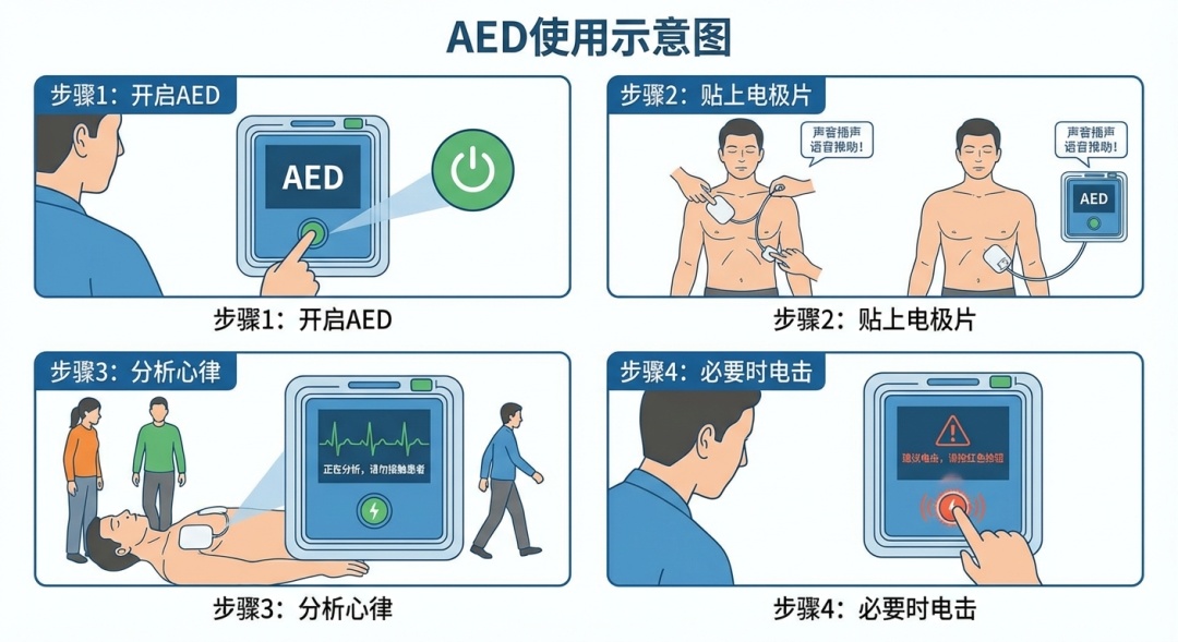 ③使用自動體外除顫器(AED):若現場有AED,應立即取用並遵循語音提示操作。AED可自動分析患者心律,判斷是否需要電擊。如需電擊,務必確保無人接觸患者,隨後按下電擊按鈕。無論是否進行電擊,均應在操作後立即恢復心肺復甦,持續至專業救援人員到達接手,或患者恢復自主呼吸與意識。