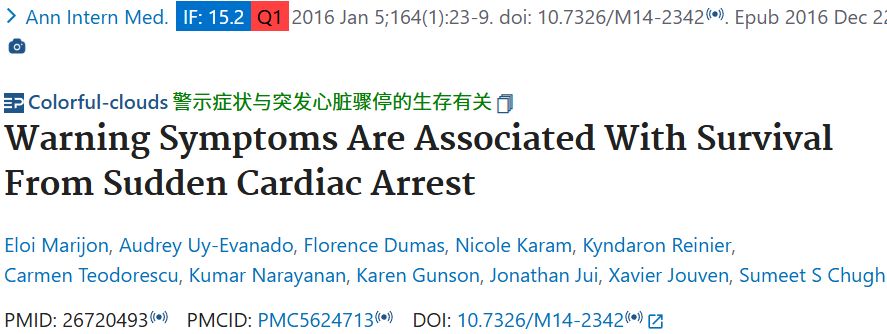 2.Marijon E, Uy-Evanado A, Dumas F, Karam N, Reinier K, Teodorescu C, Narayanan K, Gunson K, Jui J, Jouven X, Chugh SS. Warning Symptoms Are Associated With Survival From Sudden Cardiac Arrest. Ann Intern Med. 2016 Jan 5;164(1):23-9. doi: 10.7326/M14-2342IF: 15.2 Q1 . Epub 2016 Dec 22. PMID: 26720493; PMCID: PMC5624713.