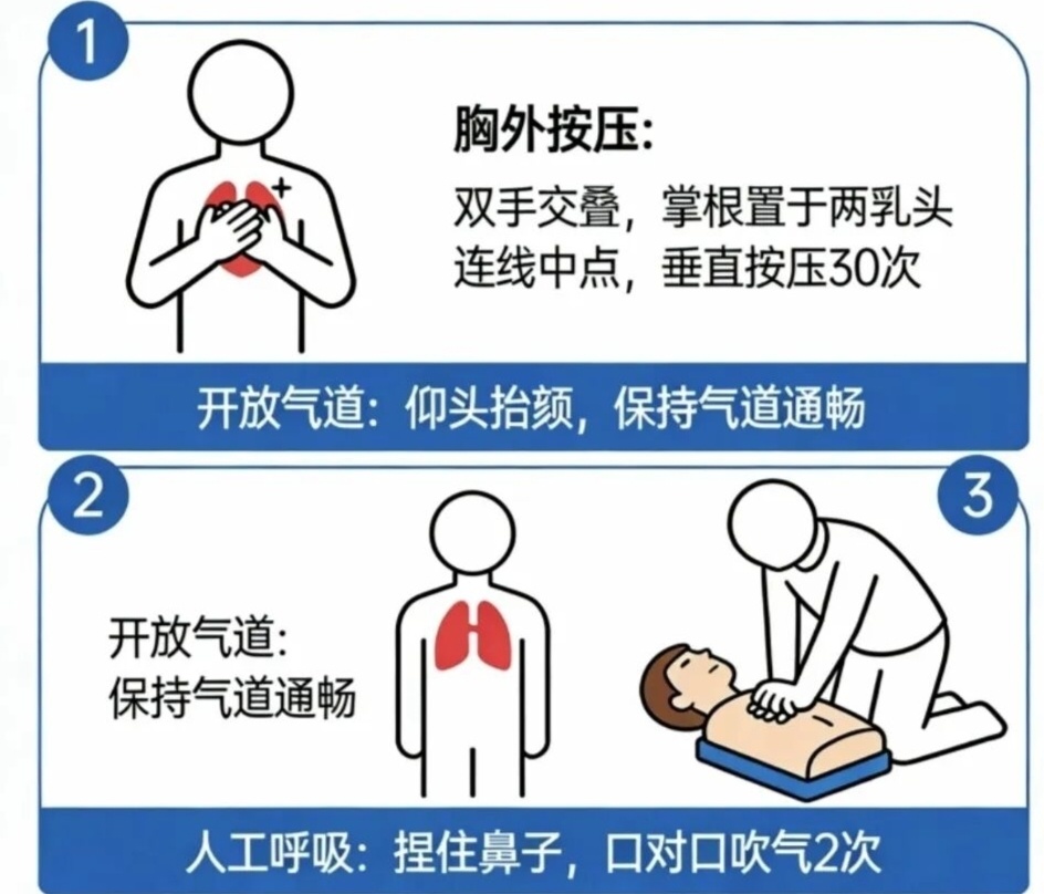 ②進行心肺復甦(CPR):將手掌根部疊放在患者胸部中央(兩乳頭連線中點),雙臂伸直鎖住,用整個上半身的重量垂直向下按壓。按壓要有力,深度至少5-6釐米,速度保持每分鐘100-120次,每次按壓後記得完全放鬆,讓胸部充分回彈。如果環境允許且您會操作,可以在每30次按壓後,捏住患者鼻孔、口對口吹氣2次,看到胸部隆起即可。如果您不熟悉人工呼吸,堅持做胸外按壓也同樣能救人。