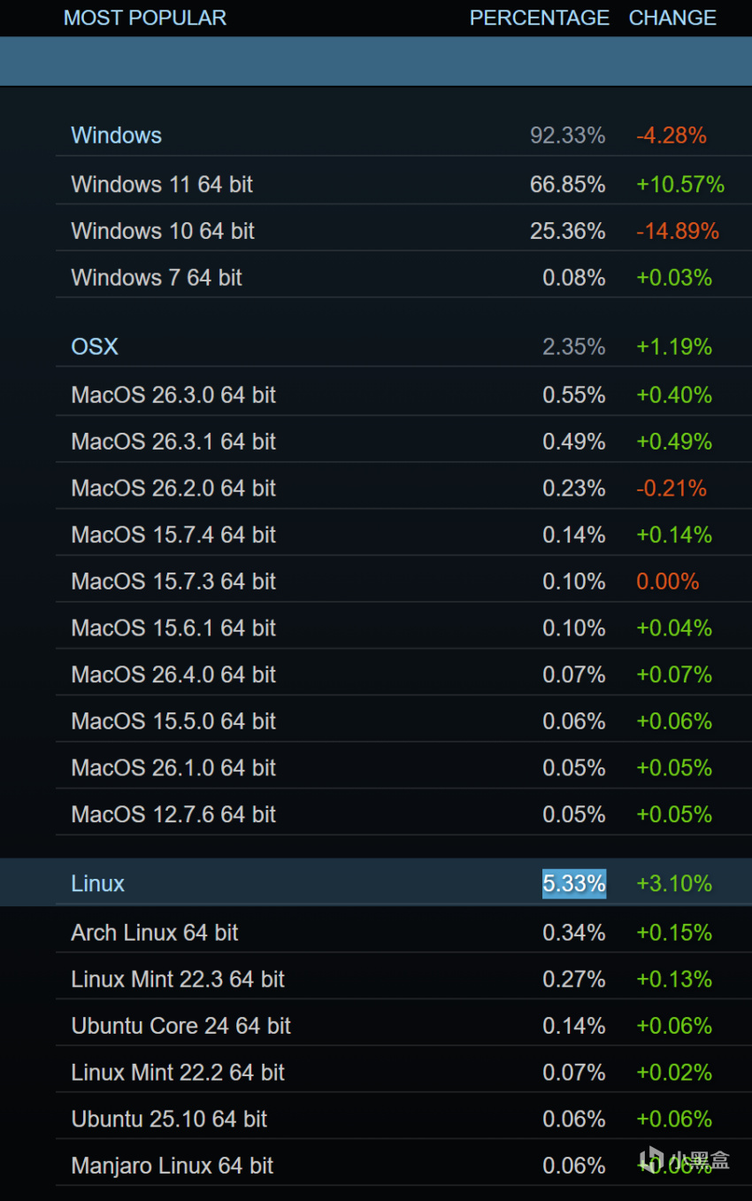 Steam 调研数据:Linux 份额升至 5.33%,体量达到 macOS 两倍以上