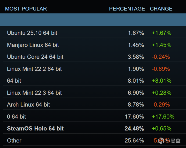 在 Linux 生态内部,3 月搭载SteamOS Holo系统的设备,占到所有 Linux 游戏设备的 24.48%。目前 SteamOS 仍是 Steam 统计中占比最高的 Linux 系统版本,领先各类桌面端 Linux 发行版。