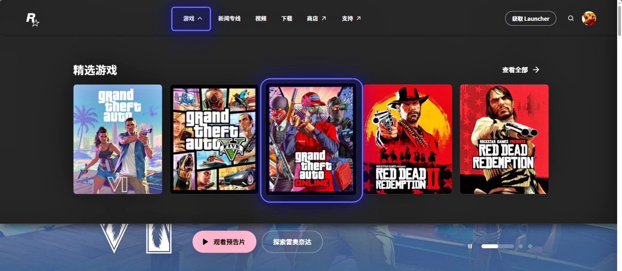 1.打开浏览器,搜索并进入R星官网。选择游戏-GTAOL。