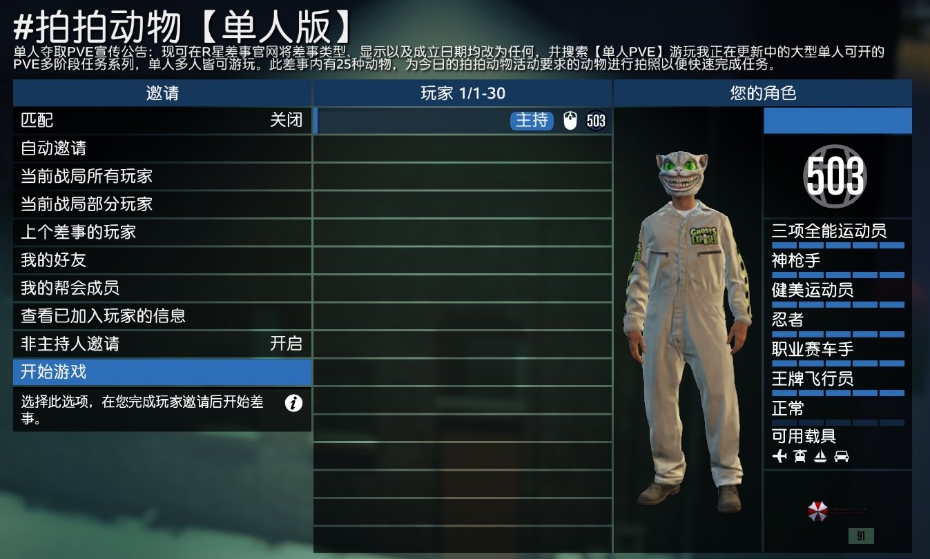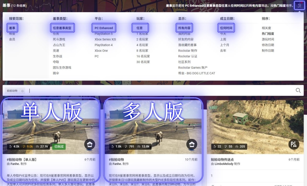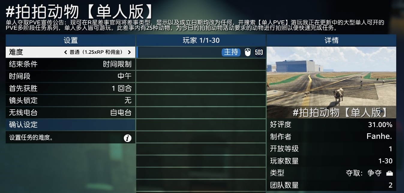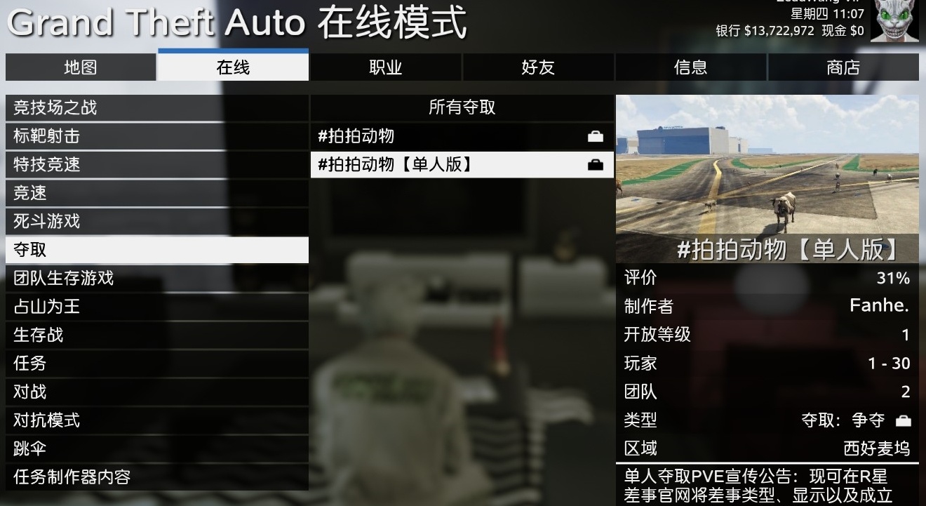 10.按ESC-在线-差事-进行差事-已收藏的差事-夺取-拍拍动物单人版。