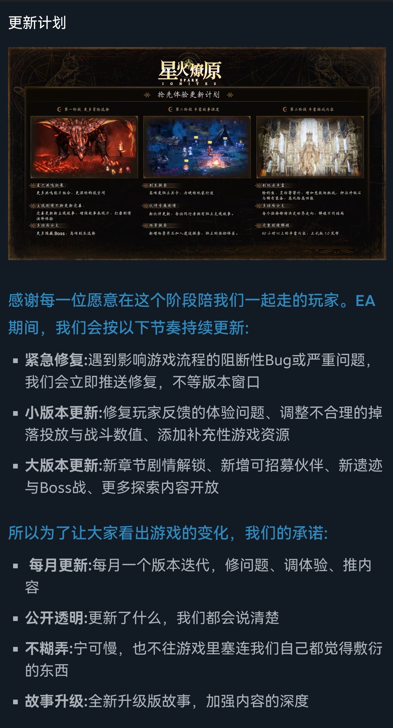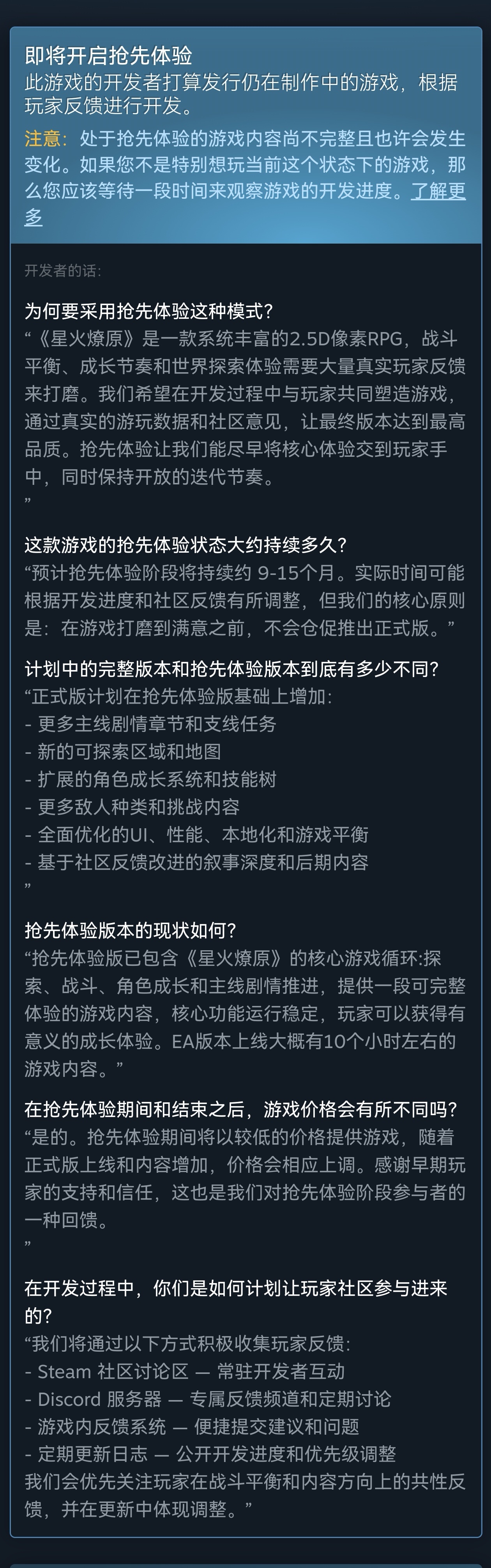 遊戲爲EA階段,當然,EA階段的時長就有10個小時左右的遊玩時長,之所以做EA,其實很簡單,因爲遊戲還沒做完,但資金已經不夠,大部分遊戲選擇EA都是因爲這個,也看看用戶的反饋。