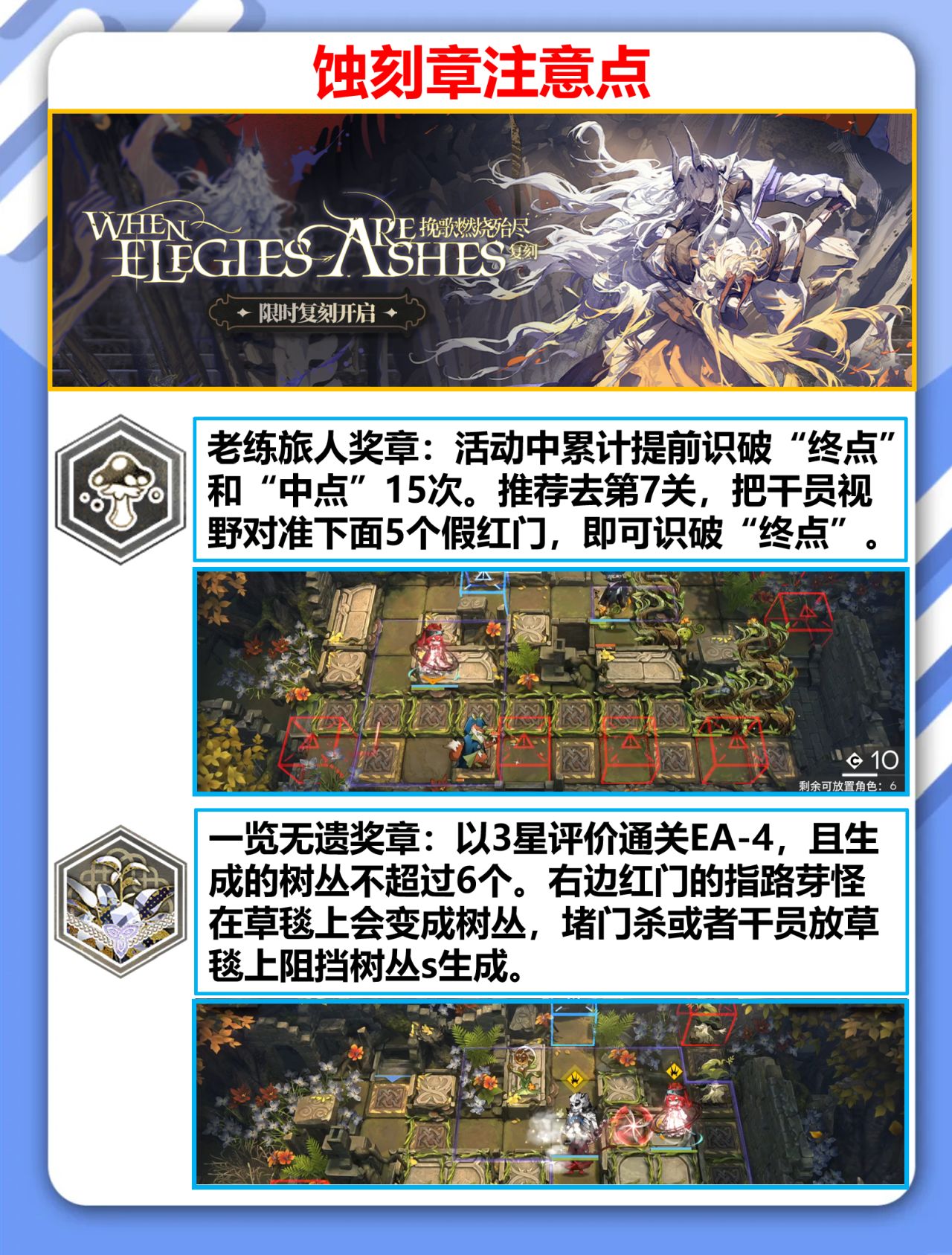 蚀刻章注意点,老练旅人奖章:活动中累计提前识破“终点”和“中点”15次。推荐去第7关,把干员视野对准下面5个假红门,即可识破“终点”。