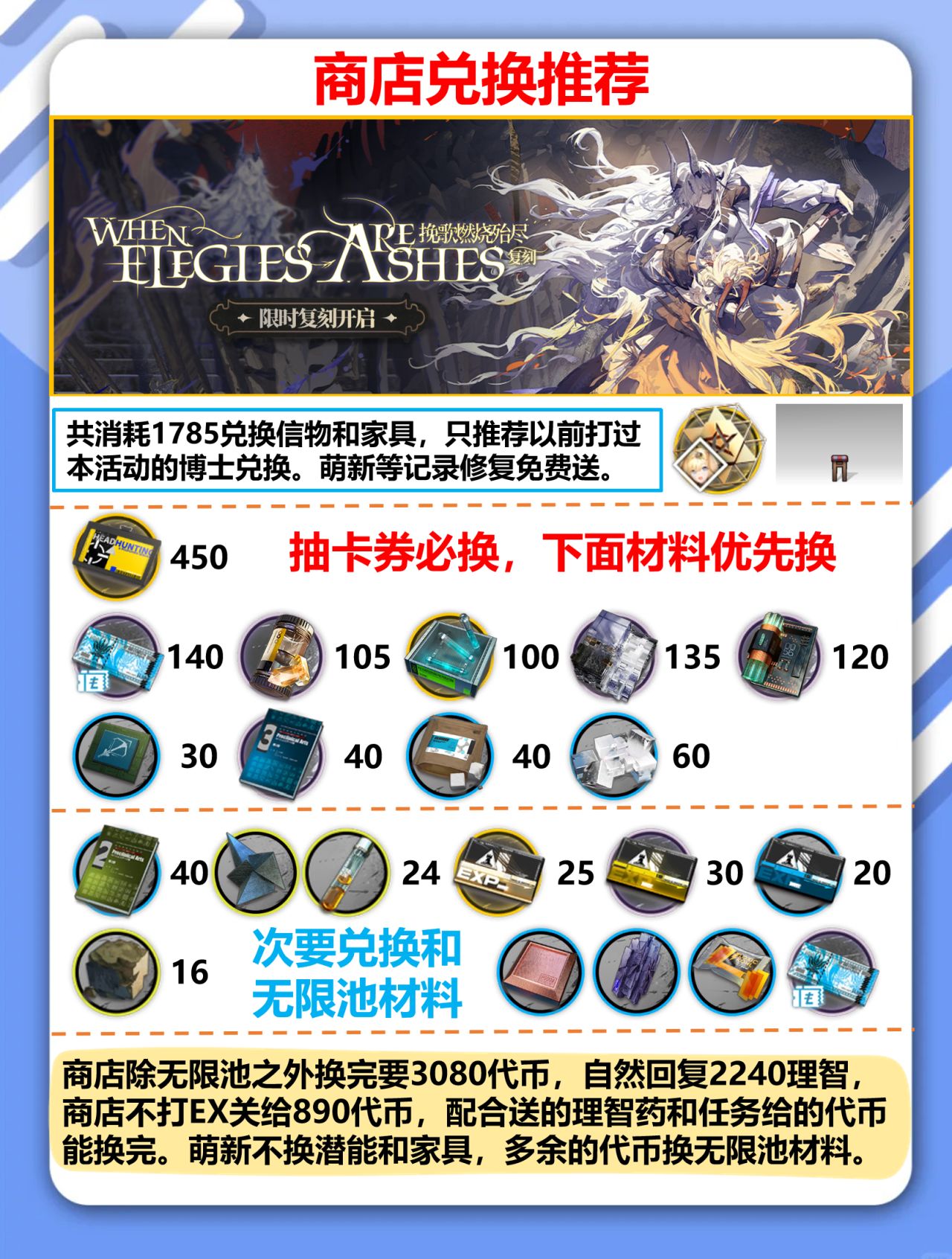 商店老玩家换完家具+任务加起来一共1900紫票。商店除无限池之外换完要3184代币,自然回复2240理智,靠每周理智药勉强换完。萌新第一次打本活动的不换潜能和家具,等复刻送。