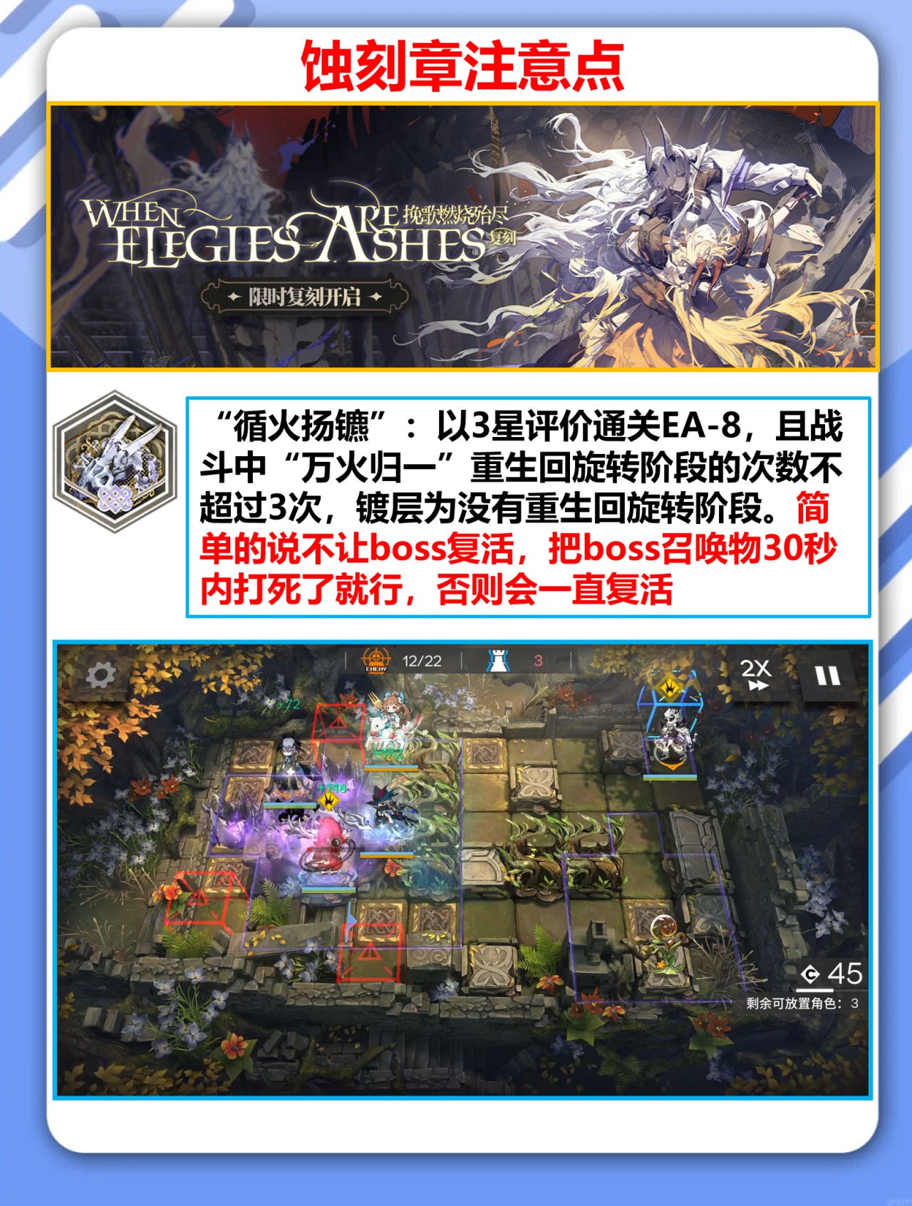 “循火扬镳”:以3星评价通关EA-8,且战斗中“万火归一”重生回旋转阶段的次数不超过3次,镀层为没有重生回旋转阶段。简单的说不让boss复活,把boss召唤物30秒内打死了就行,否则会一直复活