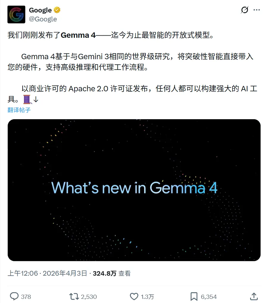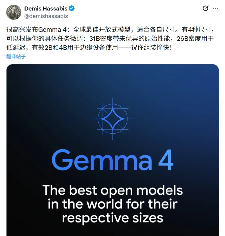 Demis Hassabis(Google DeepMind联合创始人兼 CEO)亲自下场发帖,用的词是“best open models in the world for their respective sizes(全世界最佳开源模型,大小均有)”。