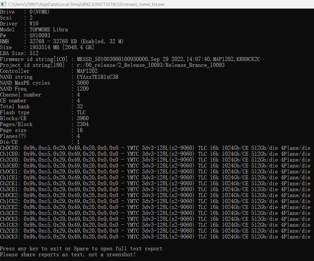 顆粒:YMTC 128層 TLC顆粒,也就是長江存儲 128層 TLC顆粒