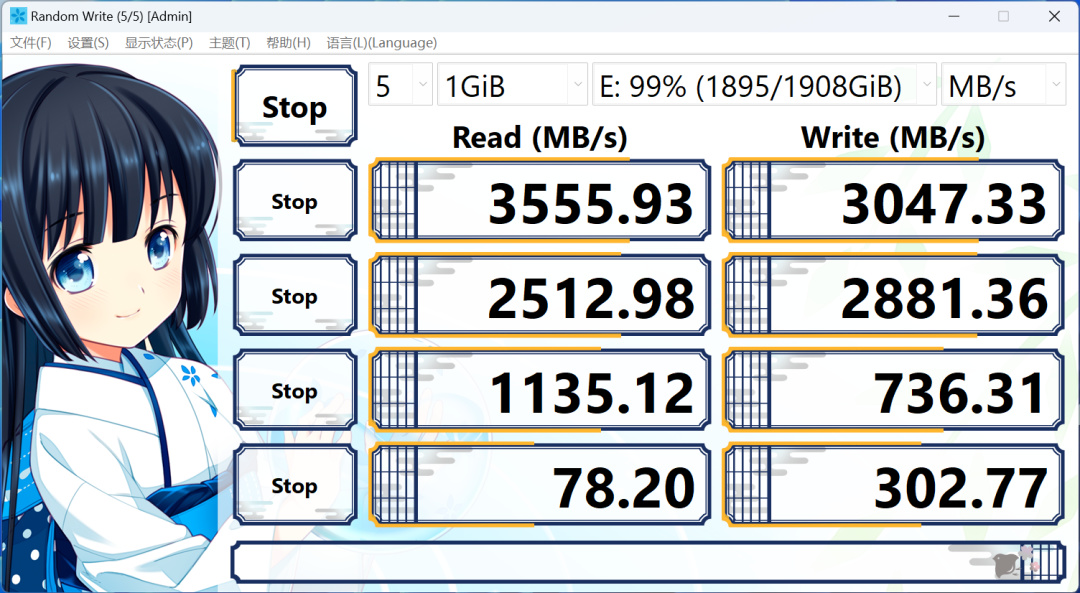連續讀取3555MB/s,連續寫入3047M/s,4K讀取78.2MB/s 4K寫入302.7MB/s。