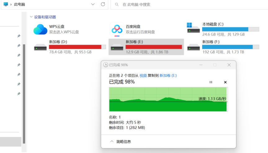 在硬盤快寫滿時,寫入速度仍保持在1GB/秒 左右,沒有出現掉速不正常情況。