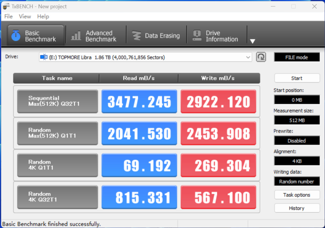 連續讀取3477.2MB/s,連續寫入222.1M/s,4K讀取69.1MB/s 4K寫入269.3MB/s。