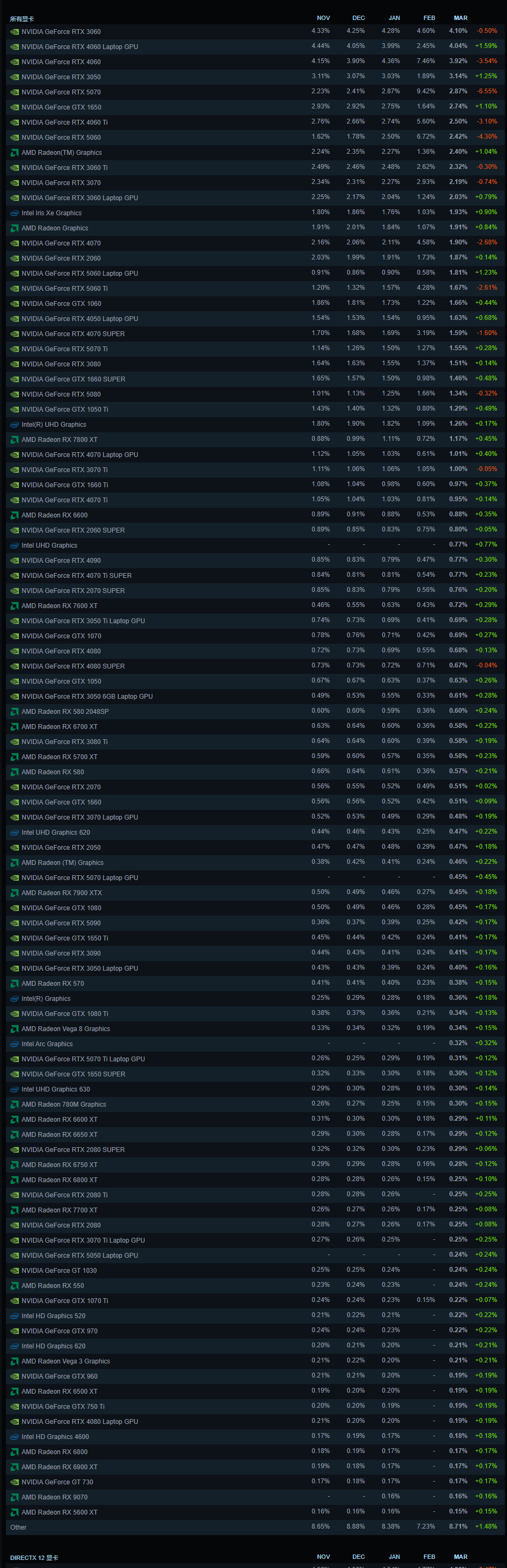 Steam 3月硬件調查:RTX 3060逆襲登頂,RTX5070退居第五