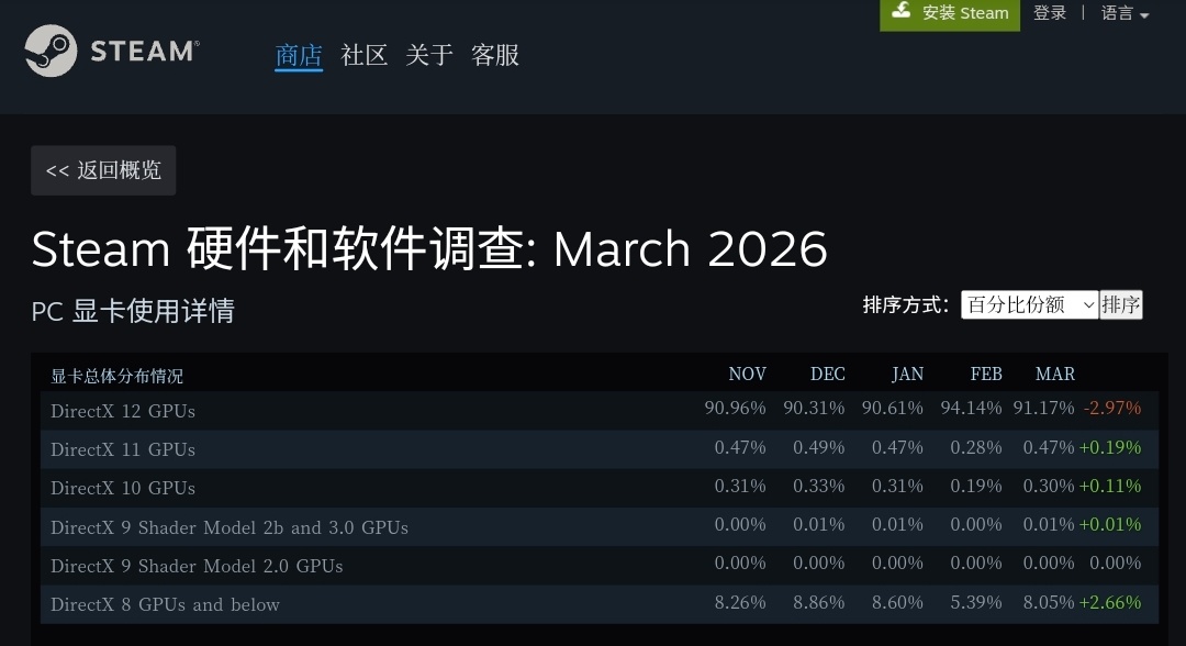 Steam硬件調查,2026年3月數據已經正式發佈,這是一份基於全球Steam平臺用戶自願匿名提交的硬件統計報告,具有非常大的樣本量,通常覆蓋數千萬活躍PC用戶,是觀察PC遊戲硬件趨勢的最權威參考之一。