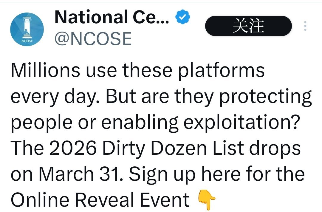 这份名单本质上是一份“倡议型问责名单”,不是法院裁决,也不是监管机构的正式处罚。NCOSE在2026年3月31日发布了今年的“Dirty Dozen List”,称其目的是点名12个“主流参与者”,并号召公众去联系企业和立法者施压。NCOSE今年把名单范围从社交媒体、聊天工具一路扩展到游戏平台和AI产品,点名的数字相关对象包括 Grok、Steam、X、Discord、Snapchat、********、TikTok,以及把 Meta 创始人马克·扎克伯格个人也列入其中。其核心叙事很清楚:这些平台或产品在设计、默认设置、审核执行或推荐机制上,可能让未成年人更容易接触到不应该接触的内容,或者让图像滥用、深伪色情等更容易传播。