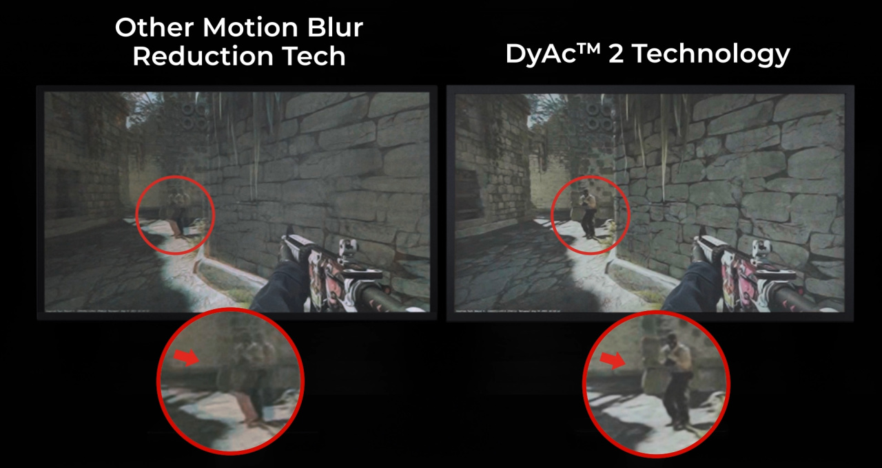 • DyAc+技術能把壓槍時的畫面抖動降到最低,彈道控制會更穩。別以爲彈道不需要控制——開槍一槍與另一槍之間是有空隙的,高玩能在這空隙裏快速修正準星,讓子彈打在一個點上。