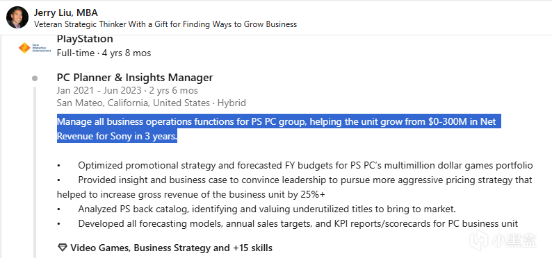 據前PlayStation PC規劃與洞察經理Jerry Liu在領英上的履歷顯示,他幫助該部門在3年內實現了從零到3億美元的增長。