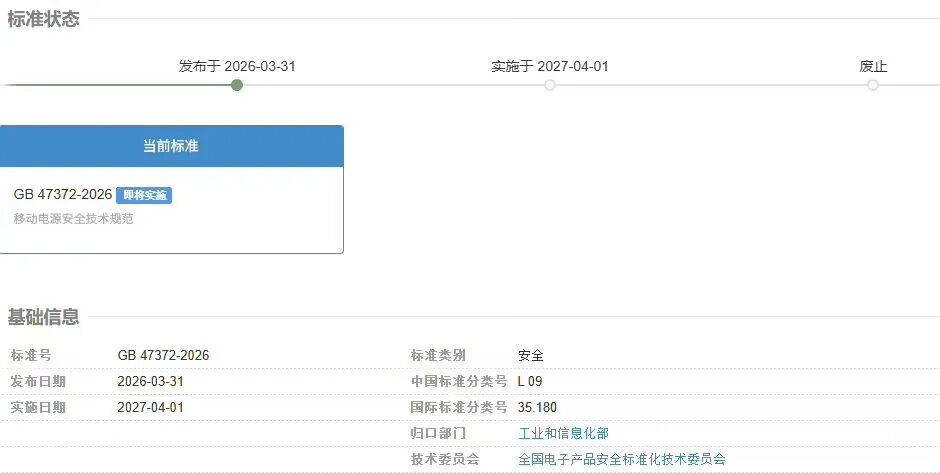 充電寶新國標出爐,歷經長時間的醞釀,我國首部《移動電源安全技術規範》強制性國家標準(GB 47372-2026)正式出爐。