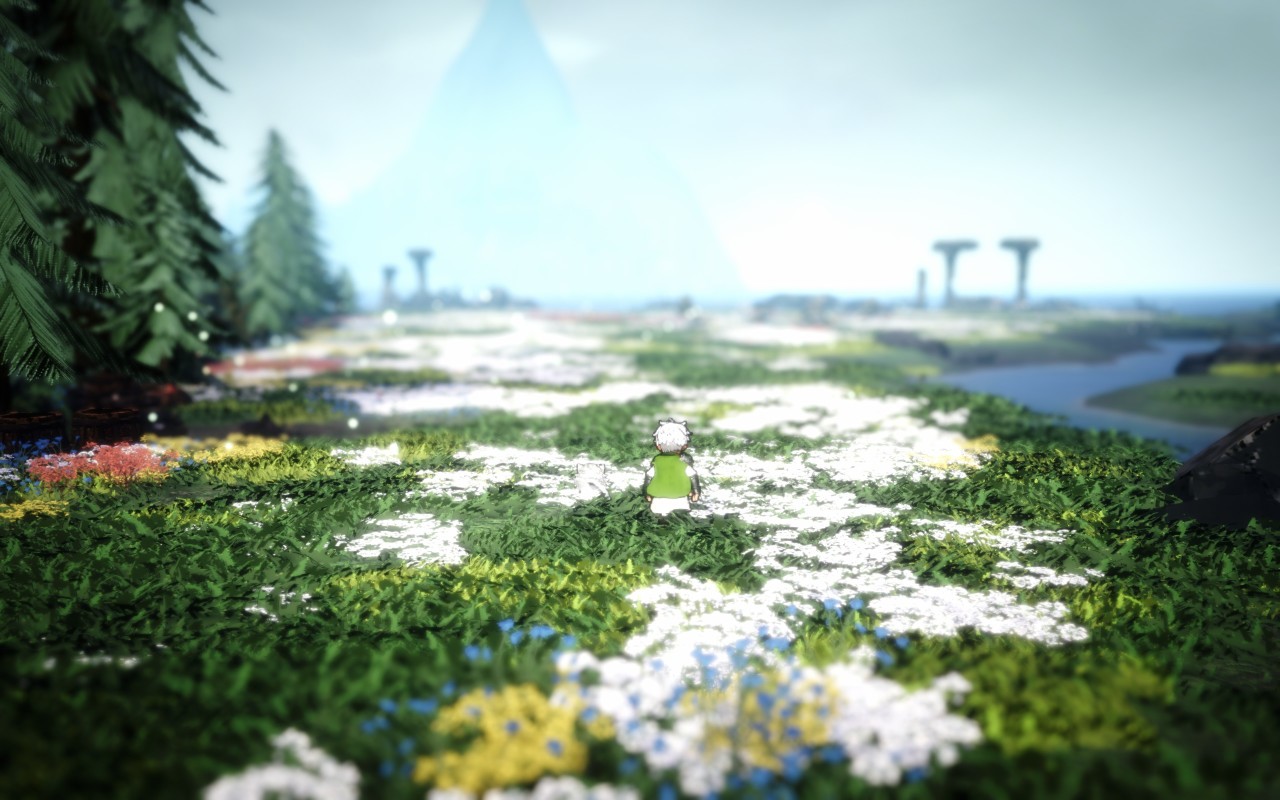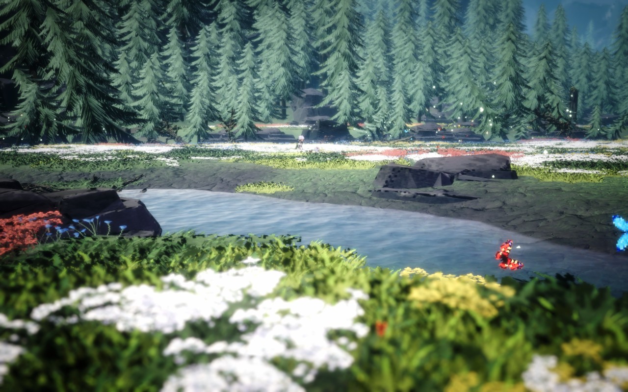 水面倒映着天空的顏色,風吹過時,像素化的草葉輕輕搖晃。