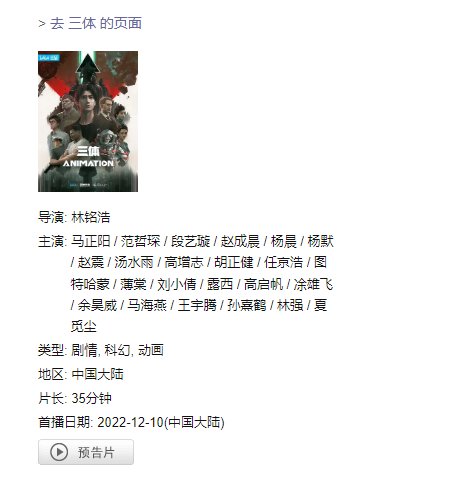 网络动画片《三体》改编自刘慈欣创作的同名科幻小说,是Bilibili、三体宇宙和艺画开天联合出品的动画 ,2022 年完成制作并在 B 站上线。《三体》动画共三季,分别是《三体·持剑》《三体·破壁》《三体·面壁》每季6集,共18集;2022 年 10 月 29 日,《三体》动画宣布定档 12 月 3 日;12 月 2 日,《三体》动画官方微博发布消息称暂缓播出 ;12 月 10 日,《三体》动画开播: