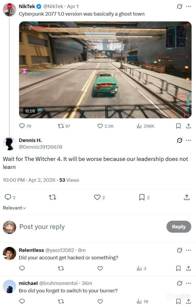 然後,《巫師4》的高級角色美術師Dennis H.在推文下面回了一句話: