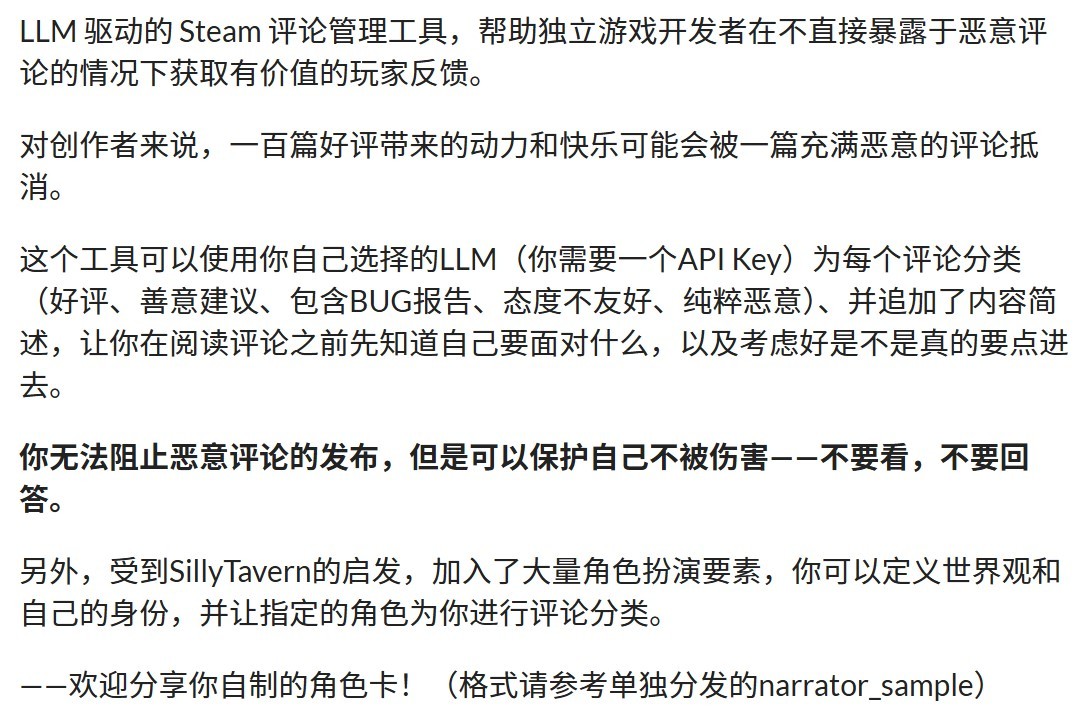 這款工具還支持設定"角色扮演"語氣要素,用戶可自行設定需要轉述的評論類型(如好評、差評、提交bug、遊戲無關、純發泄等),或是自定義轉述的語言風格。