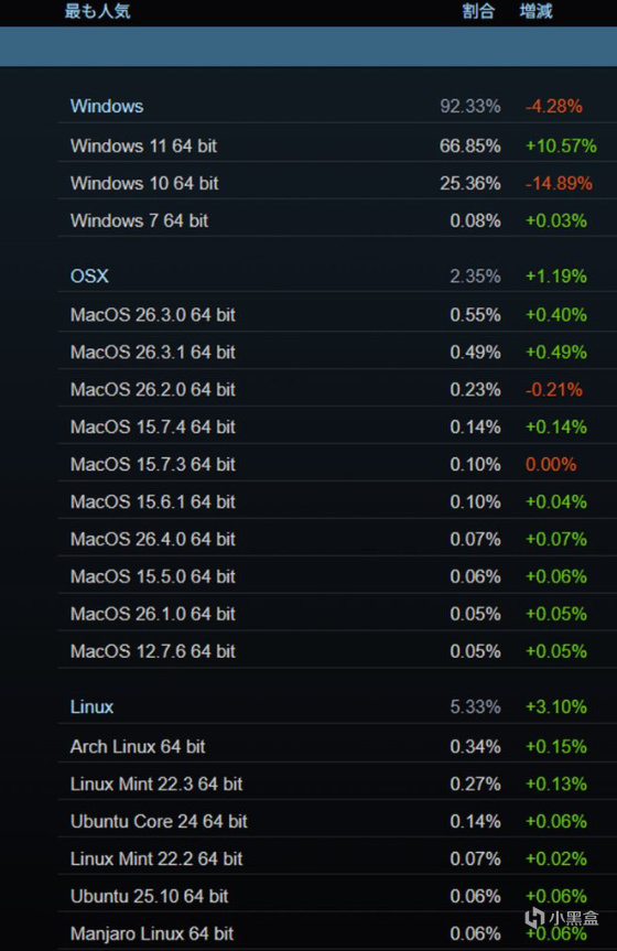 Windows仍佔據絕對優勢,份額爲92.33%,但環比下降4.28%。Linux本次大幅增長,部分原因可能與春節後中國用戶(簡體中文用戶及32GB內存配置用戶)明顯減少有關,導致Linux相對佔比提升。