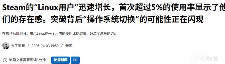 Valve於4月2日發佈《Steam硬件與軟件調查:2026年3月》報告。數據顯示,**Linux**操作系統佔比達到5.33%,環比激增3.10個百分點,首次突破5%關口,創下歷史新高。