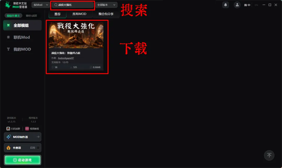 2、在右上角的搜索框中搜索“战役大强化:致敬拜占庭”和“四前置”下载完成后在下载管理选项中进行安装