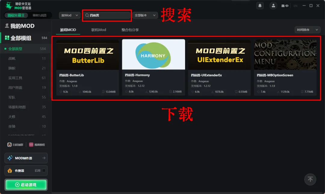 也可以直接百度搜索“骑砍中文站 下载中心”,进入下载站后搜索“战役大强化:致敬拜占庭”和“四前置”进行下载。