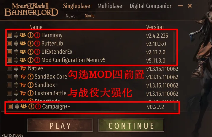 3、安装好“战役大强化:致敬拜占庭”和“四前置”MOD后,打开启动器,按照下方图片进行排序即可进入游戏.