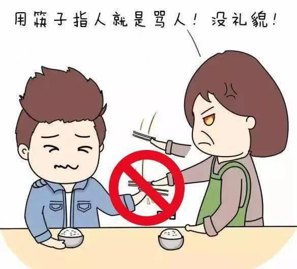 ③不能用筷子指人:在中國和一些東亞文化中,筷子指人常與“詛咒”“不吉利”聯繫起來。民間有說法認爲這像在“戳”對方,隱含希望對方倒黴或出事的意思。