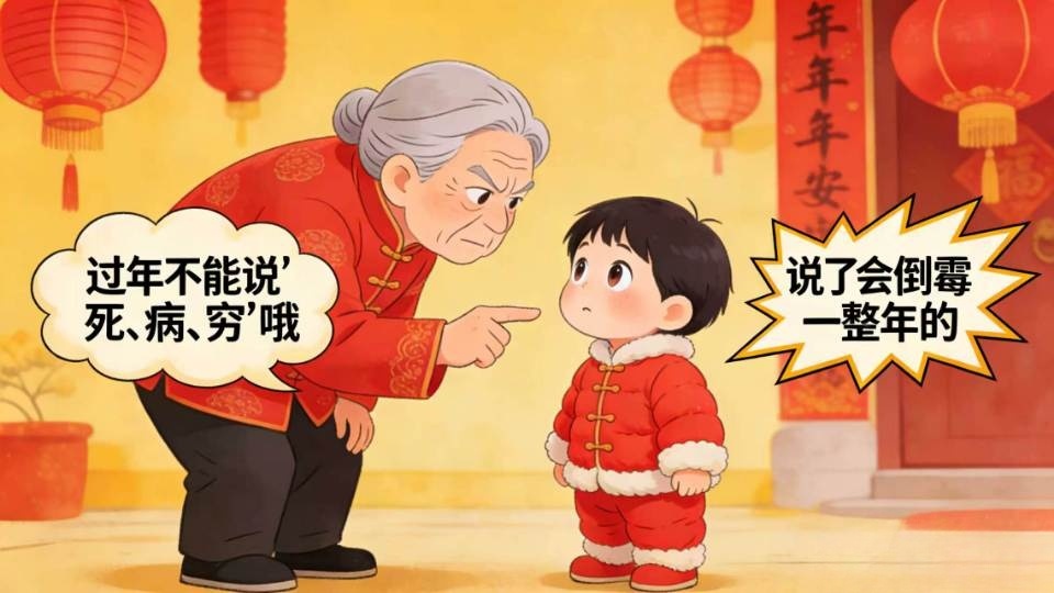 ②過年不說“死、病、窮”:“大過年的別說這些,說了會倒黴一整年”“快呸呸呸!把剛纔那句話吐掉,不然一年都不順”