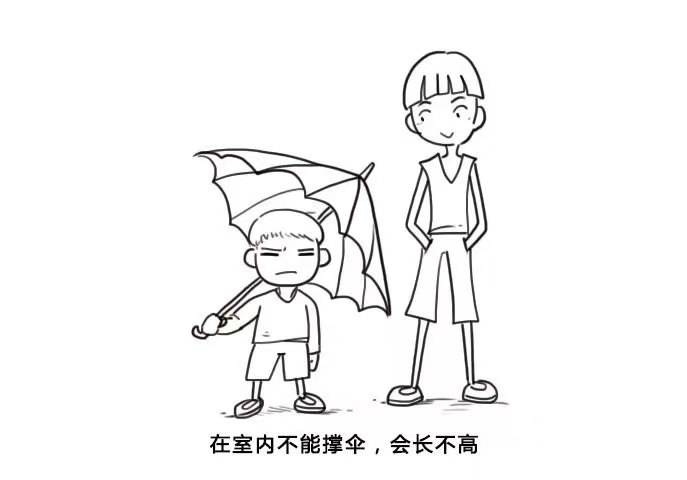 ①不能在屋裏打傘:“屋裏打傘會長成矮子”“屋裏打傘,以後娶不到媳婦/嫁不出去”
