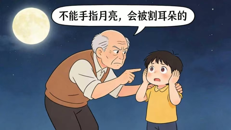 背後原理:兒童耳後的月牙形皮損被古人觀察到並附會成“月亮的懲罰”,父母利用這個說法來糾正孩子“用手指人”的不禮貌行爲,同時傳遞對天體以及大自然的敬畏。