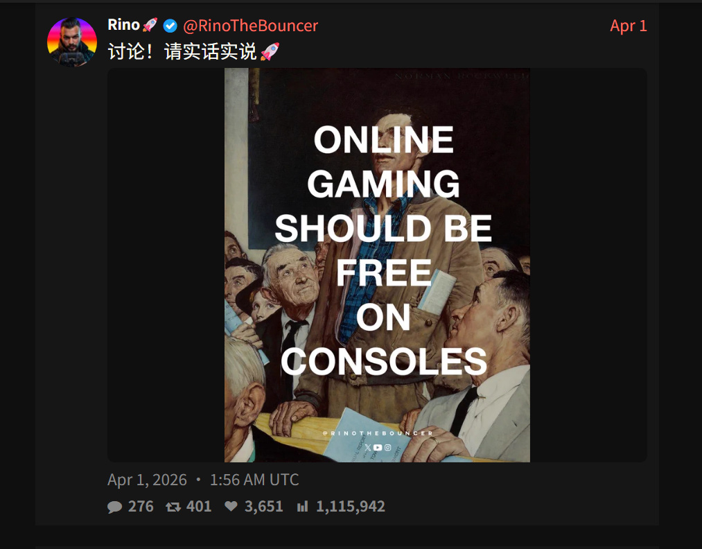 海外博主在 X 平臺發佈了“主機上的在線遊戲應該免費”的觀點圖,隨後引發大量玩家跟評。討論焦點集中在一個老問題上:玩家已經爲主機硬件、遊戲本體和網絡服務付費後,是否還應再爲聯機資格單獨支付會員費用。