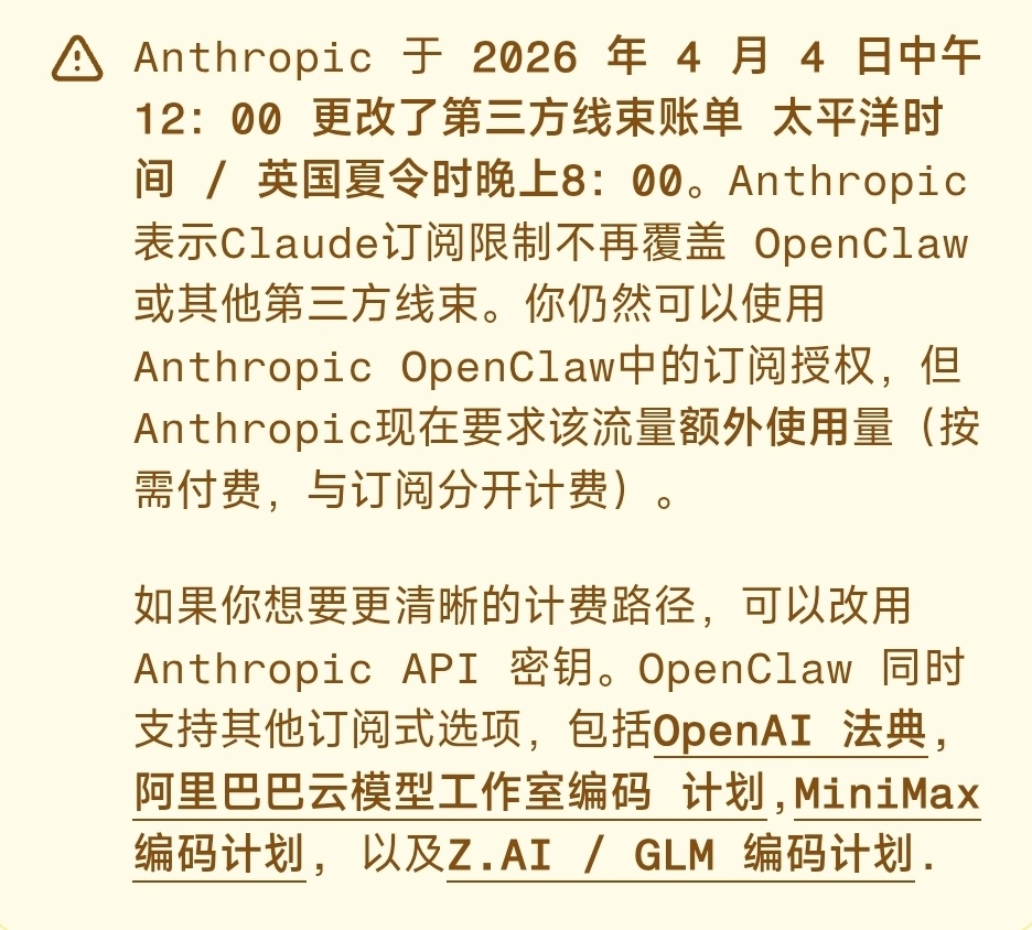 就在刚刚,Anthropic官方宣布:从太平洋时间4月4日中午12点,即北京时间4月5日凌晨3点开始,Claude Pro/Max订阅计划的额度将不再覆盖Openclaw等第三方工具的使用。