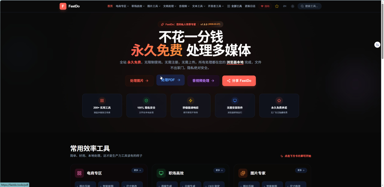一站式免费在线处理平台,集成图片与PDF全场景处理功能。支持批量自动抠图、物体擦除、图片高清化、格式转换等图片处理操作,同时提供PDF合并、分割、压缩、转Word/PPT、加密解密等文档处理功能。所有处理在浏览器本地完成,不上传服务器,保障文件隐私安全,无需注册、无使用限制,适合办公与日常高效处理文件。