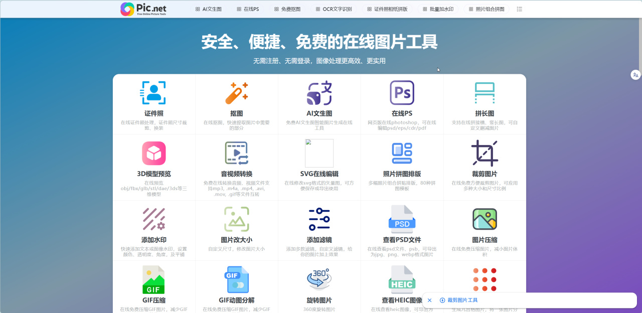 一站式免费在线图片处理与设计平台,无需登录即可使用全部功能。支持封面设计、LOGO制作、印章生成、在线PS、证件照制作、加水印等操作,涵盖图片裁剪、滤镜、抠图、格式转换等基础编辑功能。内置海量模板与素材,操作可视化、无需专业技能,适合个人设计、办公制图与日常图片美化需求。