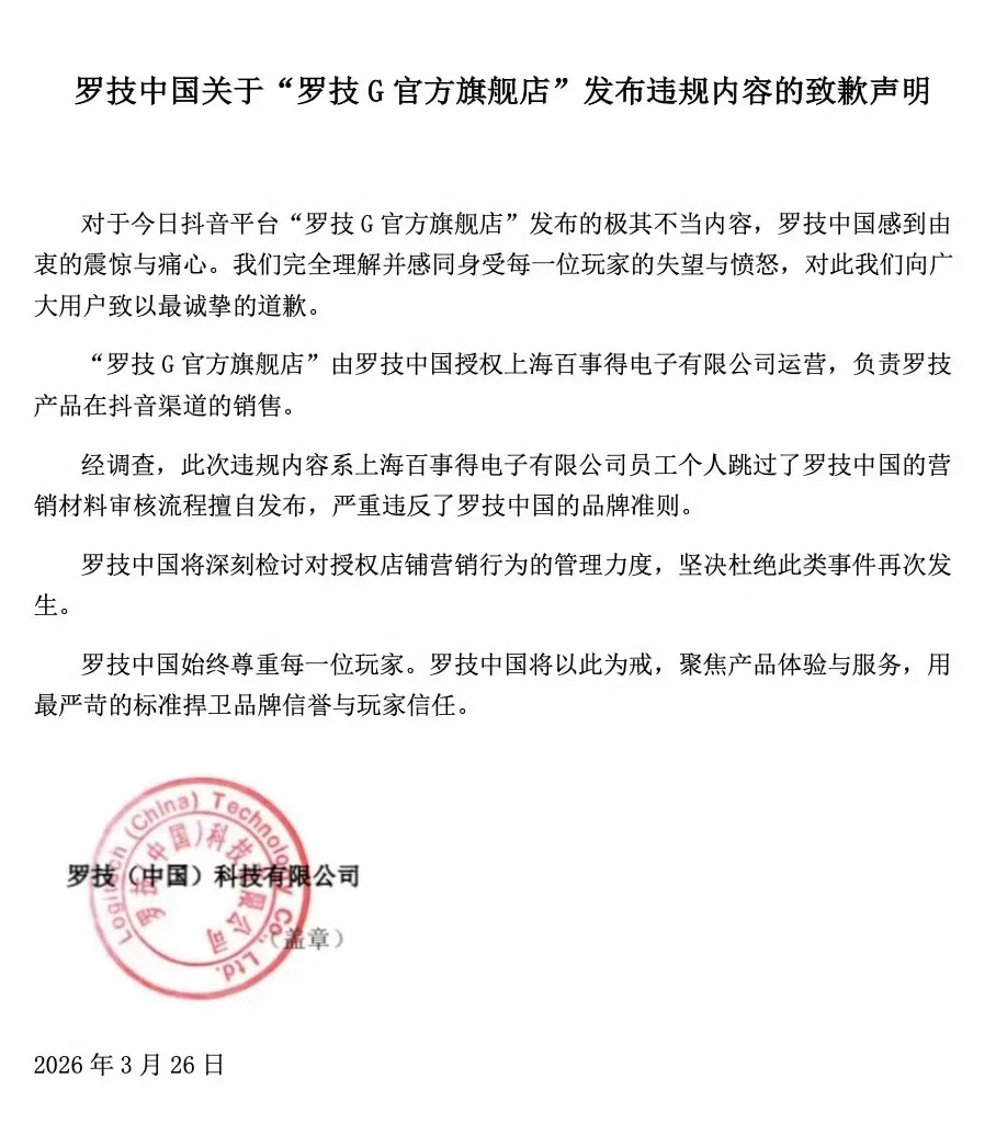 全網炸鍋,話題閱讀量破億,兩天市值蒸發5.7億美元。羅技甩鍋代運營“員工擅自發布”,致歉聲明格式錯誤、毫無誠意,被批“臨時工背鍋”。