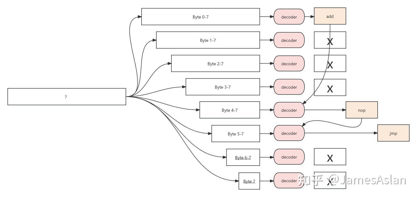 我们用空间换时间,穷举所有可能!以8Byte内容待译码为例,我们不妨将其拆分成从0-7Byte开始的8种可能,假设每一种可能都足以让我们得到一条合法指令。我们将8种假设送入8个译码器,再根据前位译码器的输出(指令长度)从后续译码器的结果中选择有效的结果。依此,在定长指令集中只需要2个译码器的事,我们花了8个译码器才解决,而且解决得并不完美。首先仍然有部分串行的内容;其次,如此巨大的扇入扇出、复杂的shuffle和结果select仍然是时序难以承受的;最后,如此巨大的资源消耗效率极低、面积的扩大也会反过来导致时序恶化,我们可能还是得拆分流水级来保证频率。天哪,难道我们陷入死局了吗?