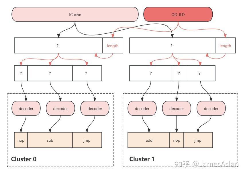 Uop Cache的问题在于存储的内容太多了,我们并不想付出如此多的代价,如果我们只存储一点必要信息,比如指令长度呢?OD-ILD应运而生。我们在取指时同时读取OD-ILD(实际上也可以将其视为I-Cache的一部分),倘若命中,则和指令内容一起供给给译码簇。以此我们能够提前划分指令边界,跳过部分译码逻辑,减少流水线深度,并极大减少了簇内译码器间的相关性。