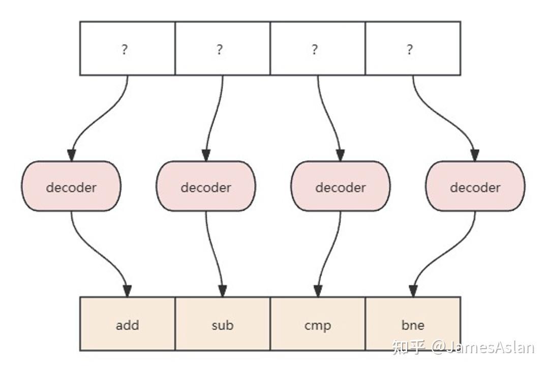 对于定长指令集,所有的指令长度均为(比如)4Byte,这就意味着指令在地址空间内的摆放都是4字节对齐的。我们在将内容未知的指令码送入译码器前就可知每一条指令的边界何在,因此我们可以直接将每条指令的指令码直接送入译码器。