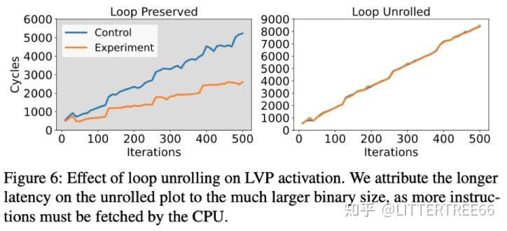 该图展示了在循环未展开 vs. 完全展开情况下 LVP 是否生效。结果显示,循环未展开(左图):LVP 生效,执行时间减少。循环展开(右图):LVP 失效,执行时间回归到正常水平。所以,我们可知,LVP 依赖于特定指令地址,如果指令地址因循环展开而改变,LVP 训练状态会丢失,导致预测失效。