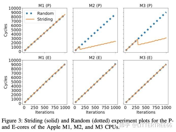 该图展现了不同 Apple 处理器的 Striding vs. Random 运行时间,由图可知,M1 处理器不支持 LAP,M2/M3 P-core 具备 LAP 。M2/M3 P-core 在 Striding 访问模式下具有预测优化,随着训练次数增加,LAP 提前加载数据,提高执行效率。M3 需要更长的训练时间(320 次 vs. 120 次),可能表明 Apple 在 M3 处理器上调整了 LAP 触发条件。但是,M2,M3的E-Core并不支持LAP技术。可能和P与E的stress分配有关。